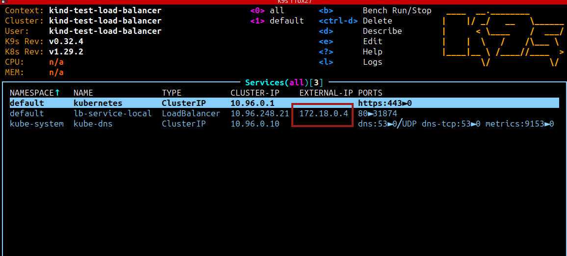 Now you should see that service lb-service-local is waiting for external ip (column EXTERNAL-IP has value <pending>)